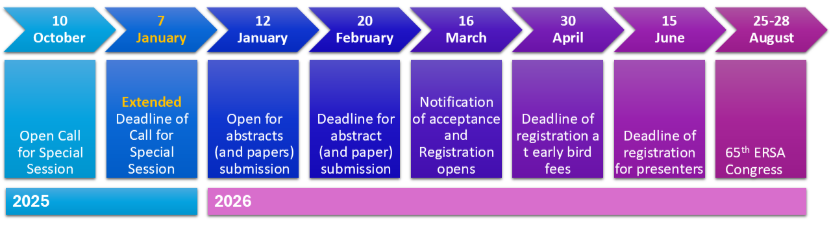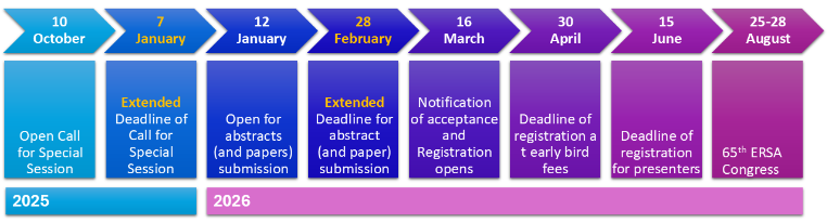The 65th ERSA congress will be held at Sofia in Bulgaria from 25 to 28 August 2026 with onsite participation only.