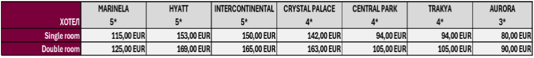 All selected hotels are located in the central part of Sofia, ensuring safety and easy access to the event venue – Sofia University "St. Kliment Ohridski". Prices and services at all establishments are in Euro (EUR).